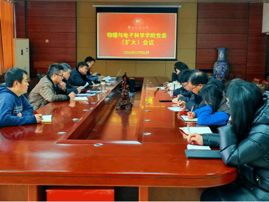 为深入贯彻落实中央、省委、省委教育工委及学校党委关于树立和践行正确政绩观学习教育的工作部署,3月6日,物理与电子科学学院在文1205会议室召开树立和践行正确政绩观学习教育启动部署会。学院党委书记陈世国主持会议,院党委班子成员及学院全体教职工生党支部书记参加会议。