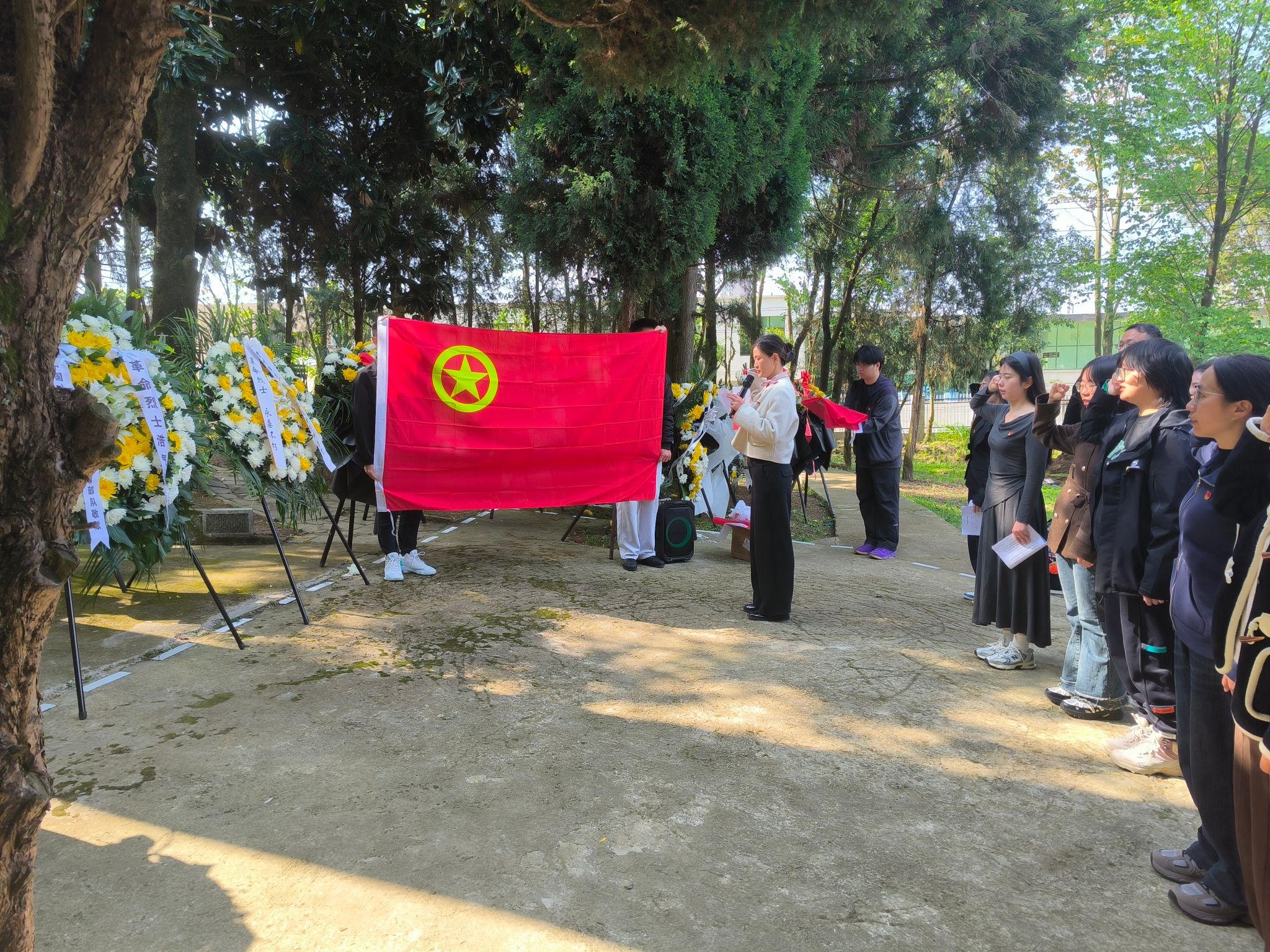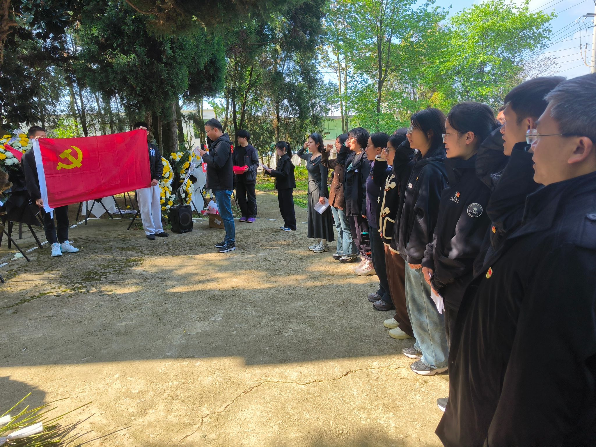 活动现场庄严肃穆,全体师生肃立奏唱国歌,并向先烈敬献花篮。在纪念碑前,全体人员向革命先烈三鞠躬,以庄重仪式寄托哀思。党员代表重温入党誓词,团员代表重温入团誓词,铮铮誓言彰显传承英烈遗志的坚定决心。