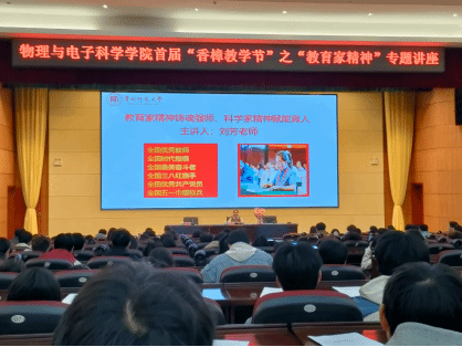 为深入贯彻落实中共中央、国务院《关于弘扬教育家精神加强新时代高素质专业化教师队伍建设的意见》精神,发挥优秀教师的示范引领作用,引导师范生见贤思齐、砥砺成长,10月27日上午,在我院首届“香樟教学节”期间,特邀全国优秀教师、“时代楷模”刘芳老师为师范生作“教育家精神”专题讲座。2023级、2024级物理学(师范)专业本科生及学科教学(物理)专业研究生近400人参加。讲座由物理与电子科学学院党委书记陈世国教授主持。